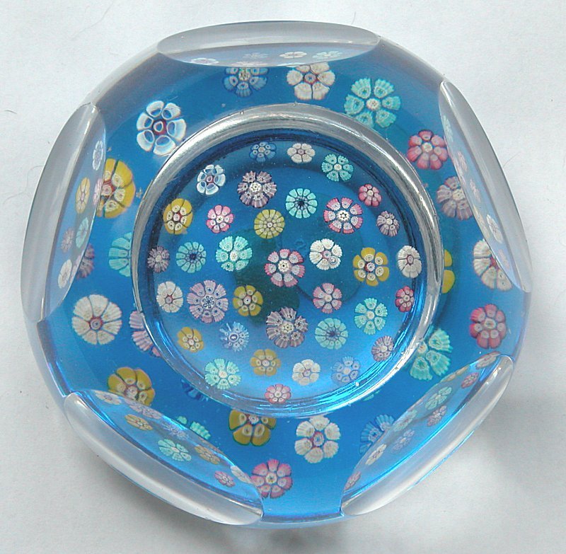 In addition to having a blue ground this has different millefiori canes to our green example. It has a date cane for 1978.