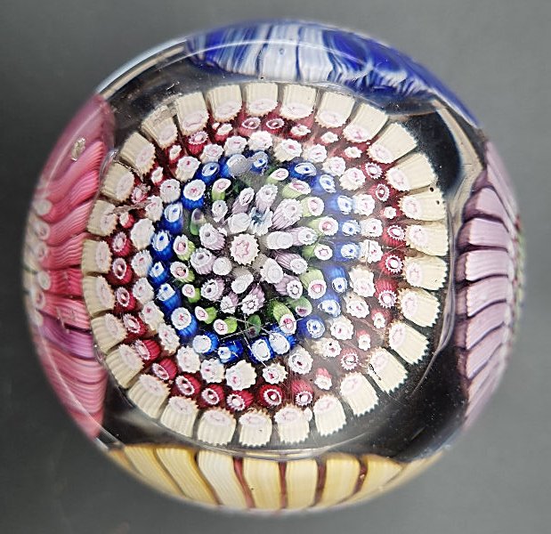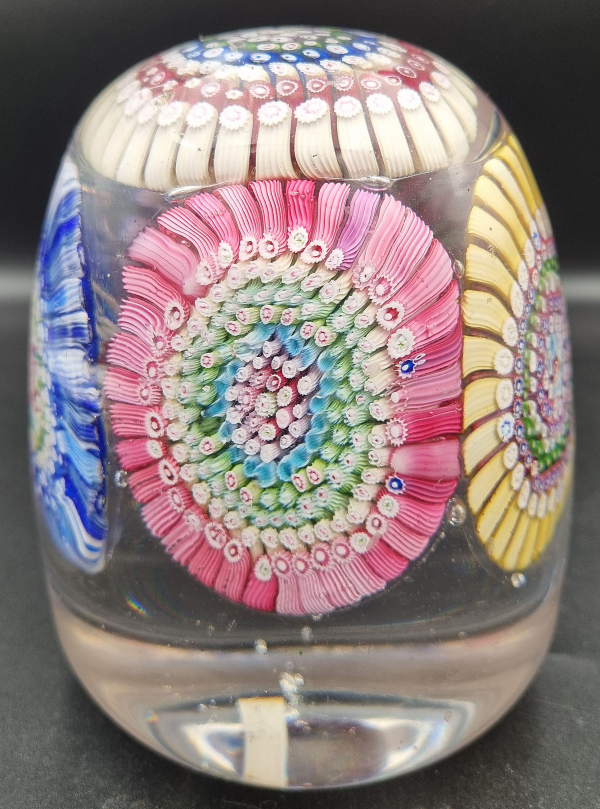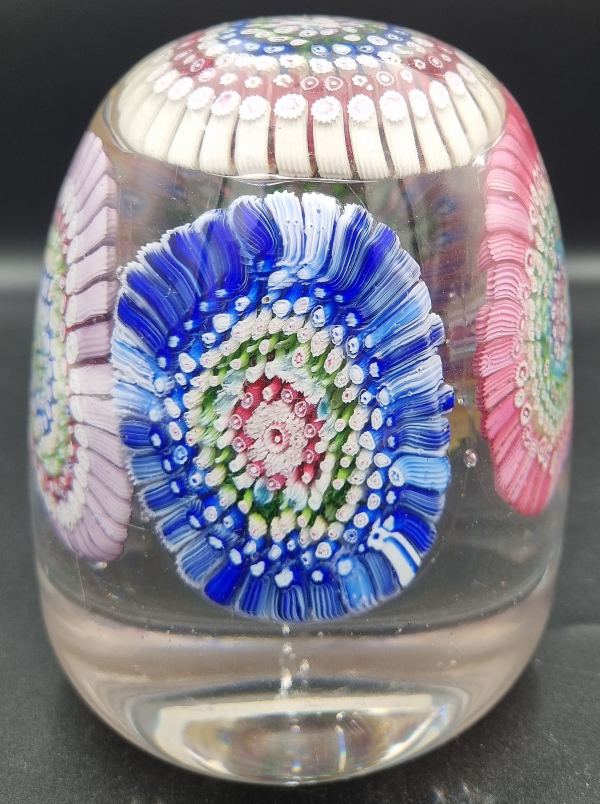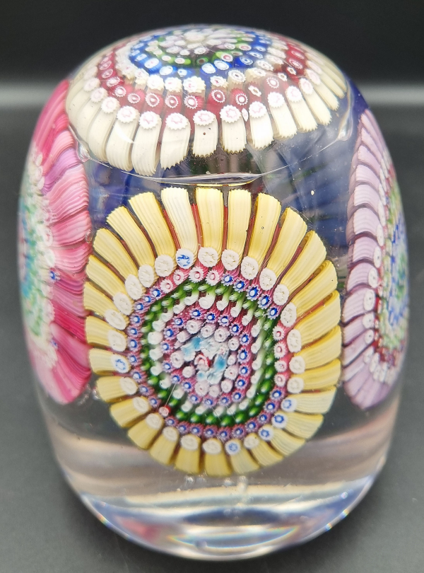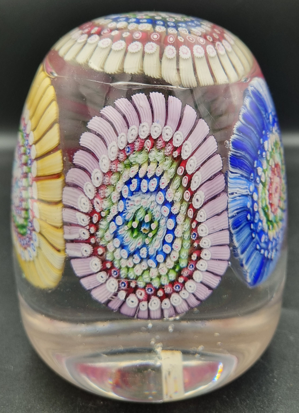 We have seen one or two of these doorstop weights made up of five millifiore concentric paperweights but they are quite rare. From a glaasworks in the Stoubridge region they must have been quite difficult to make because of their weight om the pontil rod and needing very slow cooling to avoid cracking.