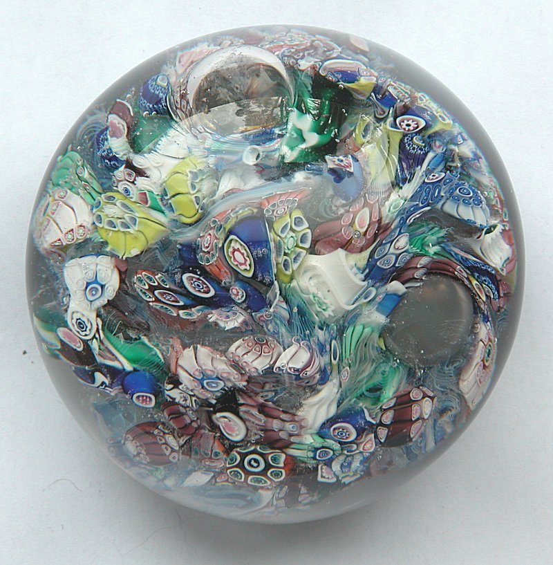 Our second NEGC scramble weight. It has a least two running rabbit canes and a large variety of twisted and broken millefiori canes and a couple of large characteristic large air bubbles. 2.5 inches in diameter and 1.7 inches high.