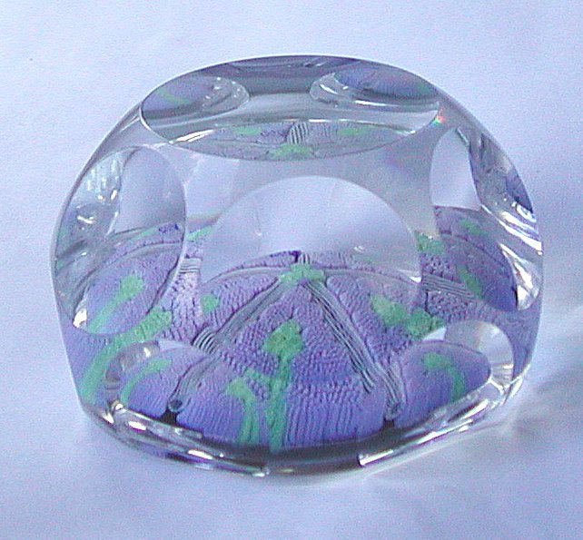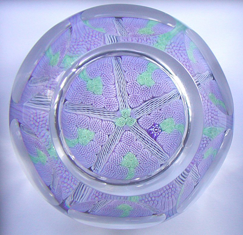 This is cutting pattern P21 not so commonly encountered. Its arrangement can only really be appreciated from the side view. It has one top circular facet and 6 smaller circular side facets. These are interleaved at the base with six further incomplete circular facets. The 5 panelled millefiore and latticino canes of pale blue and green are particularly finely executed. I find the 1975 signature cane on this particular weight a little obtrusive and could have wished it was placed nearer the edge of the set-up.