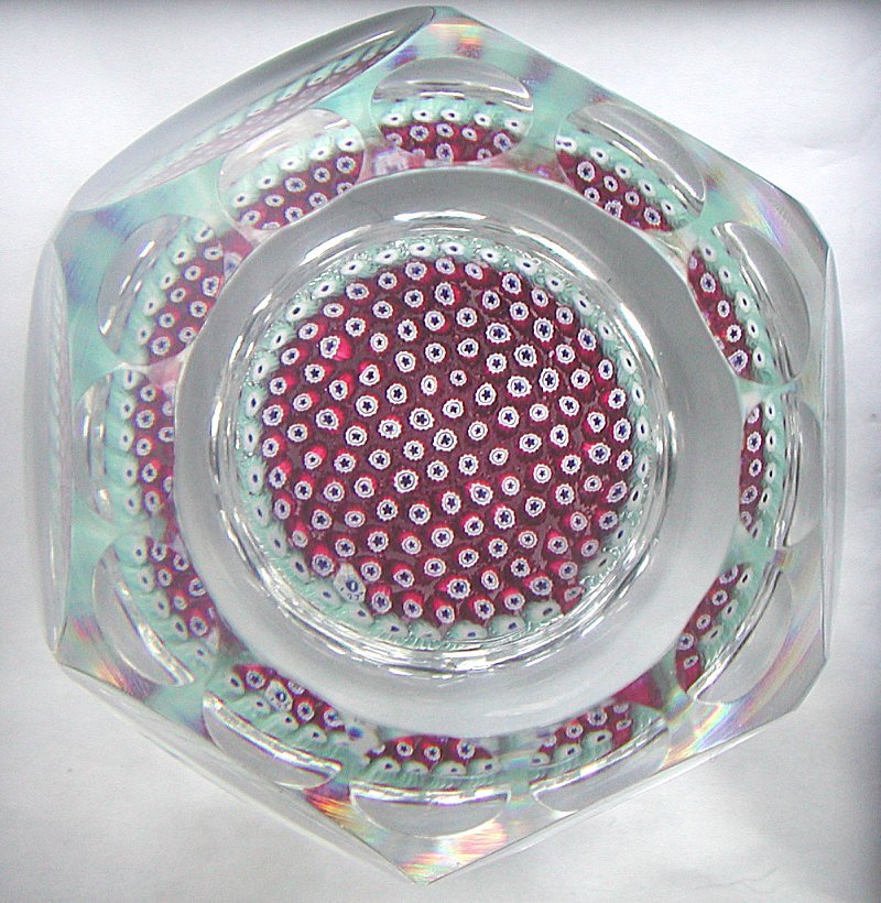 | 6 + 1 facets with a row of 12 small ball cuts above and below the main side facets. A single outer ring of pale blue canes, with one odd crimson cane (mistake?) is filled inside with a mass of the crimson and white canes. Slightly unusual white monk on a blue background 1974 signature cane
