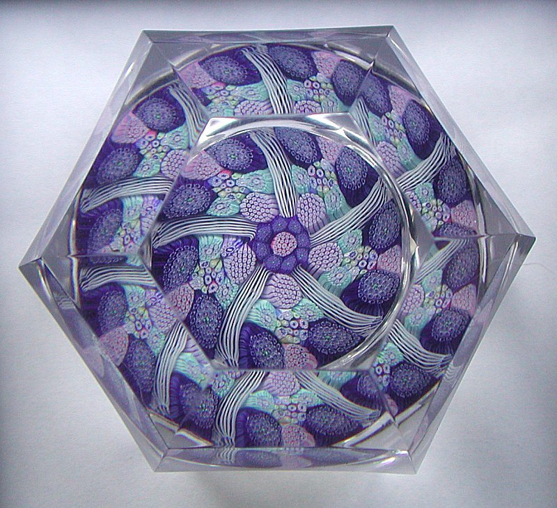 A very pretty brick cut weight with five latticino spokes separating complex canes of pale blue, lavender and dark blue. 2.7 inches in diameter and 2 inches high. A very tiny Whitefriars monk and date cane for 1975.