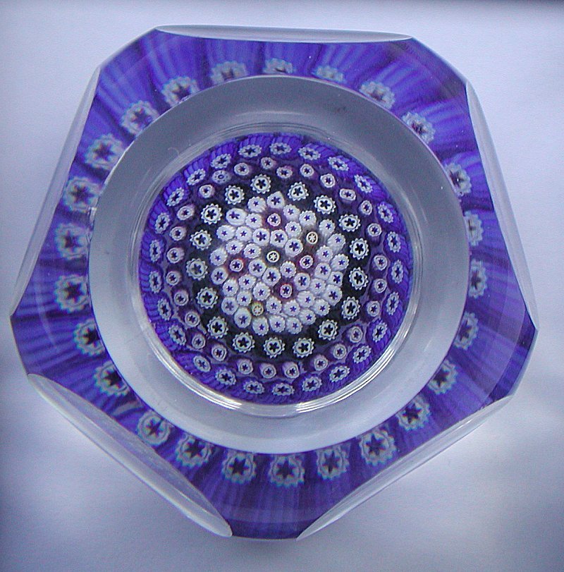 A fairly early 1972 three ring concentric of blue white and black canes surrounding a closepack of small canes mostly white with a few red and yellow ones. Standard 5 + 1 facetting.