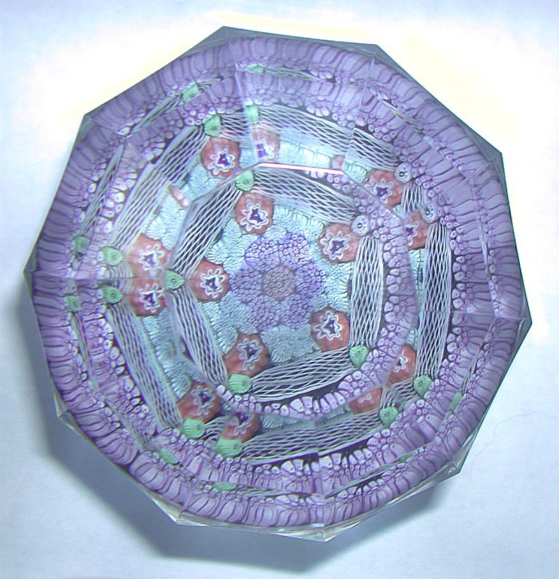 This paperweight's setup we have not seen illustrated in books nor encountered another weight like it. The facet cut pattern is a standard small brick cut. The date cane is for 1972 of the early white monk variety (very tiny). The outer row of canes is a ring of complex mauve canes. Inside this is a pentagon of latticino which encloses an array of blue and orange complex canes in a symmetrical close pack formation. Very complex for such an early weight and with lovely colour contrasts.