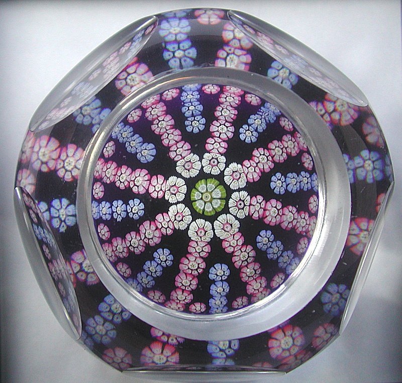 A 3.2 inch diameter weight with standard 5 + 1 facets. Has a very neat pattern of radial white, blue and pink canes on a navy blue ground. Very tiny 1978 date cane.