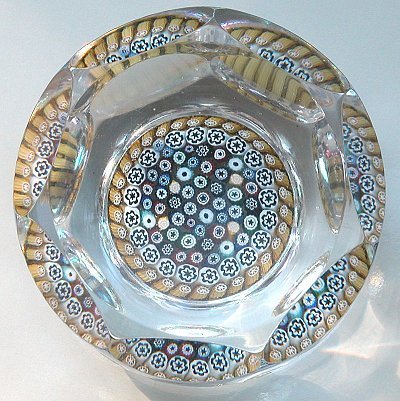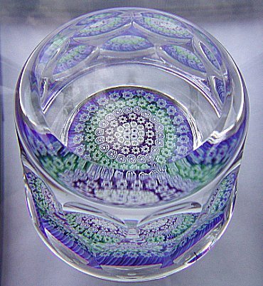 This cylinder has different cutting. Seven large eliptical cuts at the side and seven bottom and top edge facets. The cane arrangement is two outer concentric rows and an inner random array. Date cane for 1972.