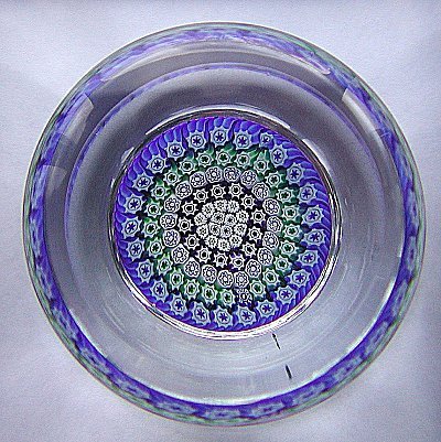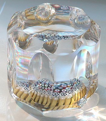 One style of weights which Whitefriars produced have this unusual cylindrical format. A little narrower than their usual weights at about 2.7 inches they are taller than most at 2.5 inches. They suffer from lack of magnification of the millefiori canes. This example has a standard arrangement of six concentric cricles of canes and includes a date cane for 1975. This example has two rows of ten depressed elliptical facets. | /tr>