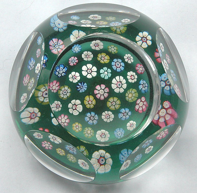 A fairly unusual Whitefriars paperweight with spaced millefiori canes on a dark green ground.. It is 3.2 inches in diameter and has one top facet and five side facets and has a Whitefriars date cane for 1977. Also available in blue! An experimental red ground spaced millefiore paperweight is also in our collection.