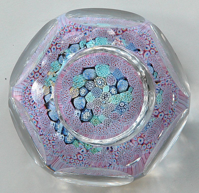 We have not been able to find an exact pattern designation for this Whitefriars paperweight. It has random mix of complex close-packed canes surrounded by a ring of complex pink, blue and white canes. It is 3.2 inches in diameter and has rather unusual faceting, a lower ring of six circular side facets and an upper ring of twelve small circular facets and one top facet. It has a Whitefriars date cane for 1973.