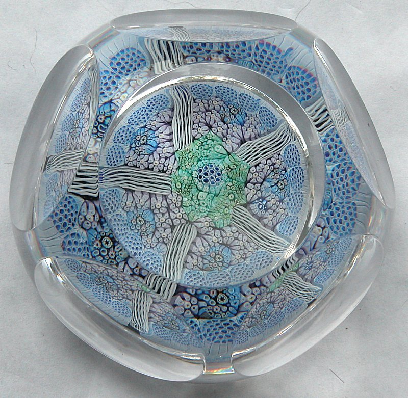 A Whitefriars weight with complex blue and green canes divided in five segments with latticino canes. It is 3.2 inches in diameter and has one top facet and five side facets and has a Whitefriars date cane for 1975.