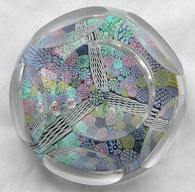 A Whitefriars weight with an amazing variety of complex canes divided in three segments with lattacino canes. It is 3.0 inches in diameter and has one top facet and five side facets and has a Whitefriars date cane for 1976.