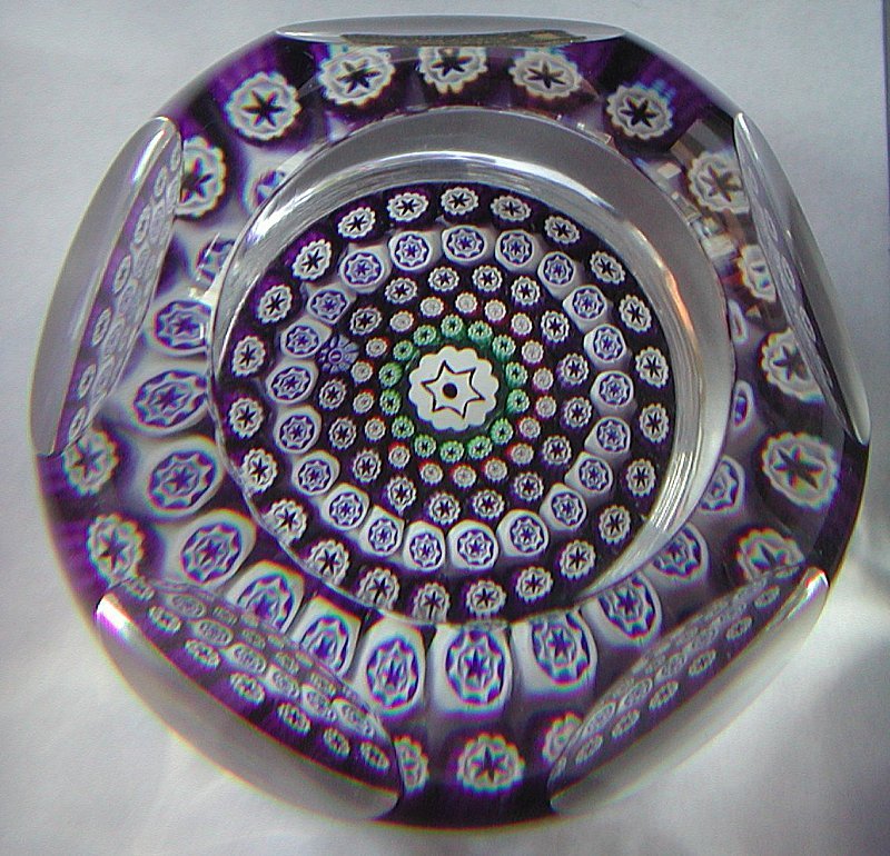 Perhaps the most common type of Whitefriars paperweight produced in the 1970's is this type of concentric millefiori pattern. Five rings of canes surround a central star. The overall colour effect makes this a smart example. It is 3.2 inches in diameter and has one top facet and five side facets and has a Whitefriars date cane for 1978.