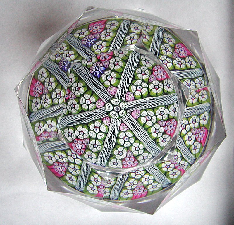 Another very pretty pattern based on six panels divided by latticino canes. The faceting is the Whitefriars P18 with large quadrilateral and pentagonal side facets and a hexagonal top facets which works well with the millefiori pattern. It has a Whitefriars date cane of 1976 and is 3 inches in diameter and 1.9 inches high.