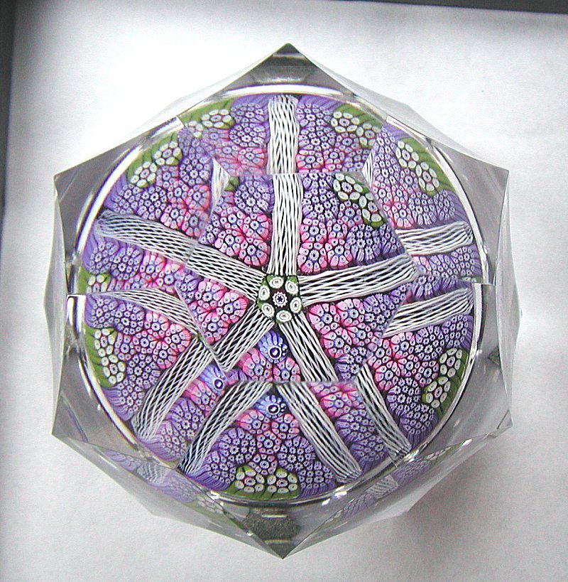 This is a similar weight to the one on the previous page but is divided into five panels with latticino twists. The canes in the panels shade from pinsh to blueish from the center to the periphery. Two contrasting lime green canes are in each panel at the edge. It has a Whitefriars date cane of 1976 and is 3 inches in diameter and 1.9 inches high.