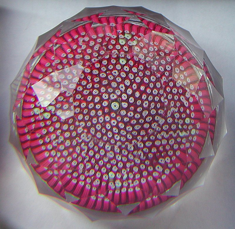 We are told this was a somewhat experimental Whitefriars paperweight. It has no date or Whiterfriars cane but there is little doubt of its origin because of the glass density and the typical Whitefriars pontil. A mass of identical red canes including a small heart shape with just five regularly arranged pale green canes. The weight is heavily faceted with diamond and pentagonal cuts with a central dodecahedral window. Because of the complex cutting the weight is only 1.5 inches high but of a normal 3.2 inches diameter.