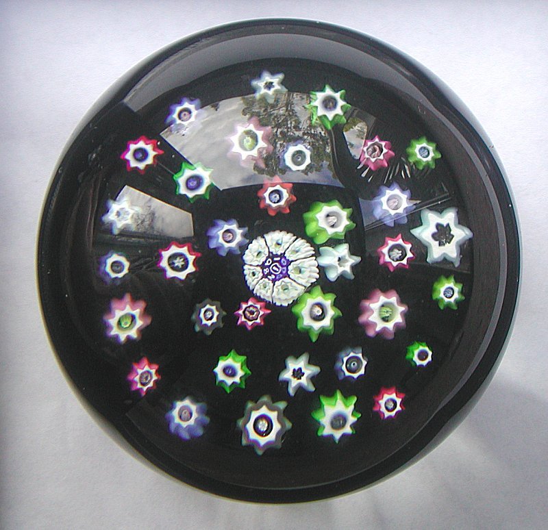 Spread of Roses is a spaced millefiore weight on a very dark red ground. 2.8 inches in diameter. Central Whitefriars cane for 1982. Designed by Colin Terris, the edition was planned for 750 but only 275 were made. This example has no inscription on the base and is not facetted so possibly it was in production when the edition was closed off and never completed.