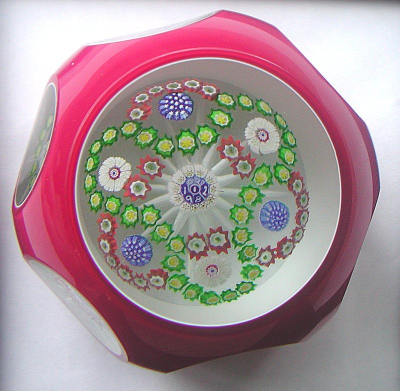 This is one of the first Whitefriars range paperweights produced by Caithness in 1982. Designed by Colin Terris and produced in an edition of only 100. The blue and white canes are very Whitefriars like, but the red and green canes of the double trefoil garland are not colours that Whitefriars would have used and not as good quality. On the other hand the double overlay is much better quality than Whitefriars ever made and the overall effect is pleasing. 2.9 inches in diameter with a central whitefriars date cane for 1982. This example is numbered 27.