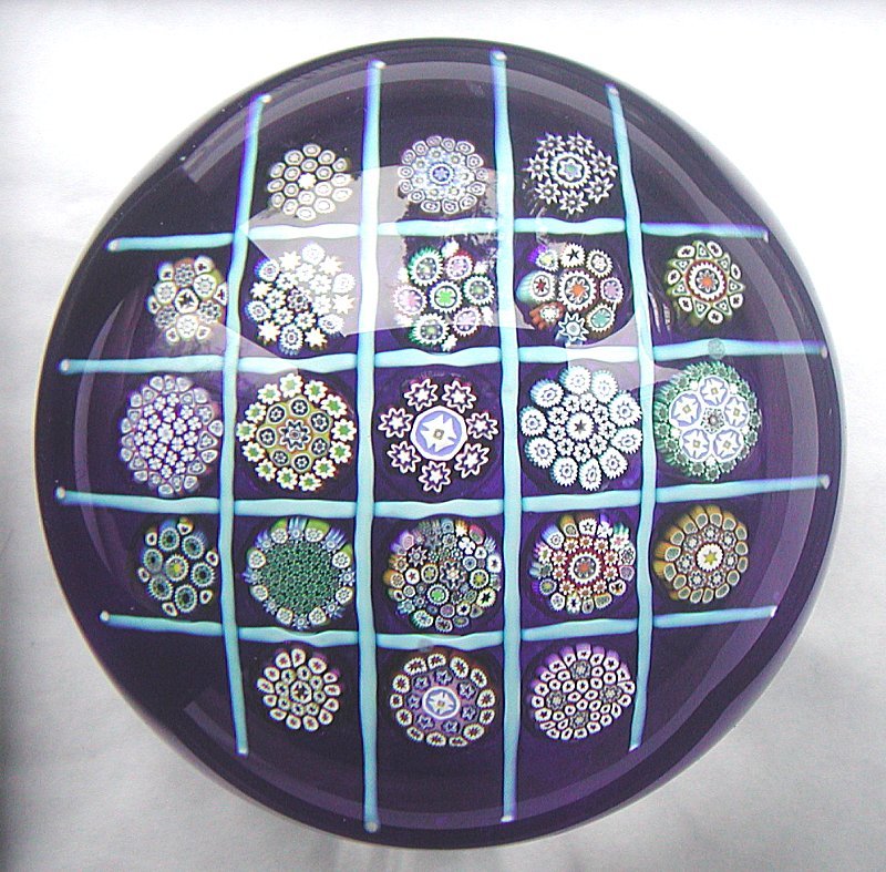 21 complex canes are laid out on a deep blue background separated by a light blue grid. Unfacetted 3 inch diameter weight made in 2006.