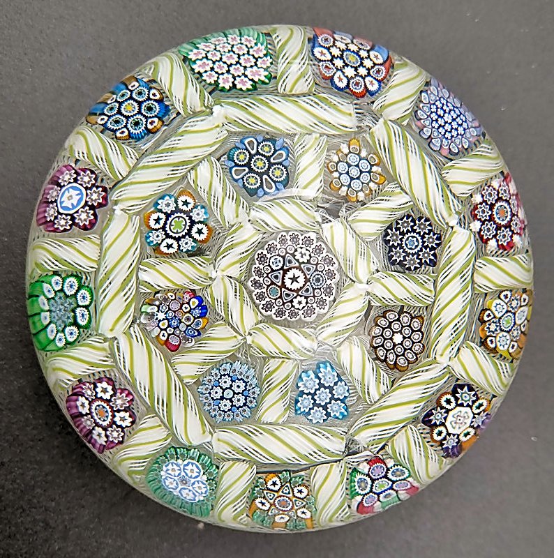 A Peter Macdougall, barber pole weight made in 2005. Complex canes separated by a green and white latticino.
