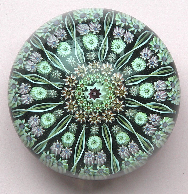 The PP2 is a 2.5 inch paperweight with about 12 radial spokes and a standard 1-1-2-2 pattern of millefiore canes. The details of the canes, spokes and colouring vary considerably and it is not easy to find two identical weights. Made over a long period the earlier ones have fire ground bases and are sometimes quite similar to Strathern paperweights of the same design. Latter ones from about 1978 have a hollow ground base and a P signature cane and are more precise.