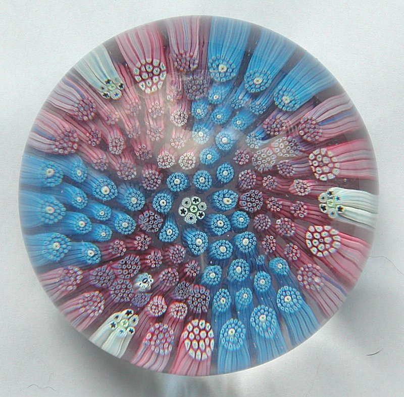 An unfaceted panelled closepack weight. A rather unusual design, in this case a bit loose and possibly rather early experimental design. It has a Whitefriars date cane for 1971.