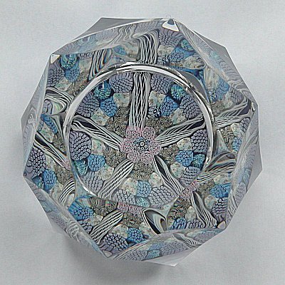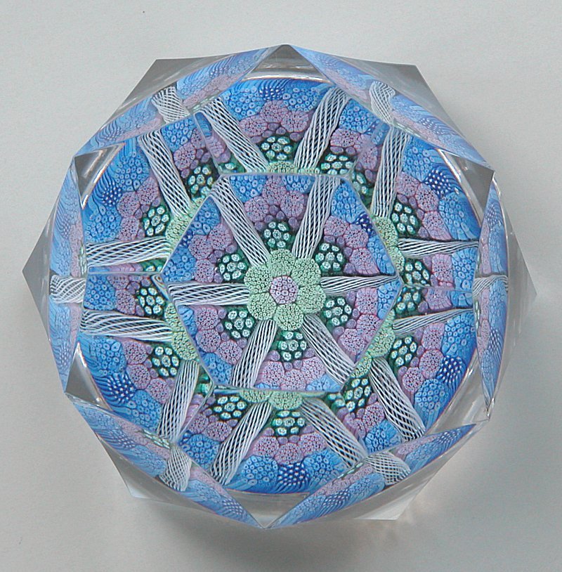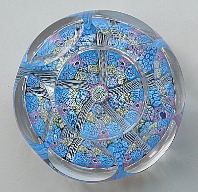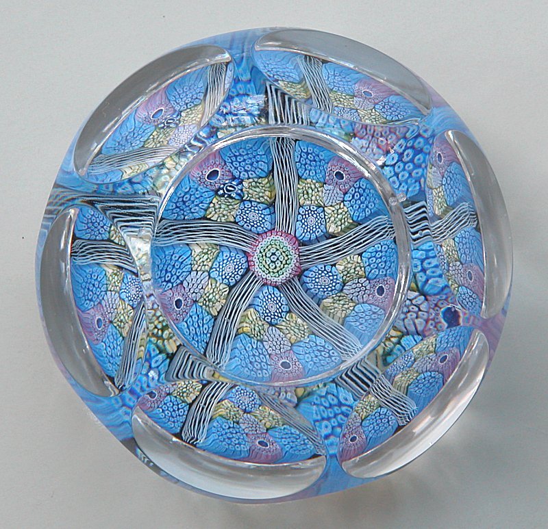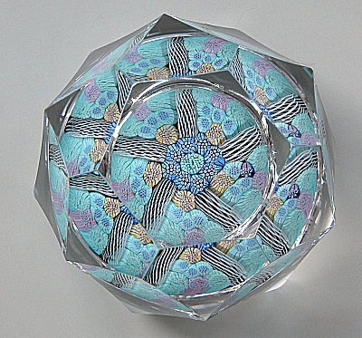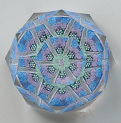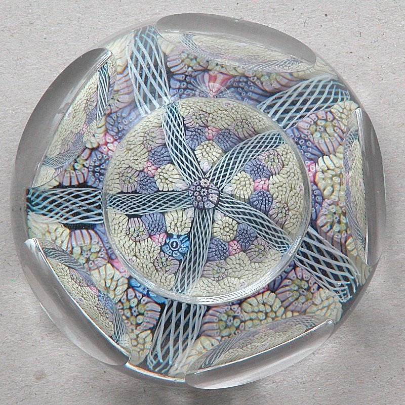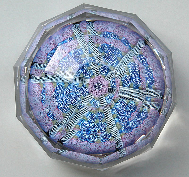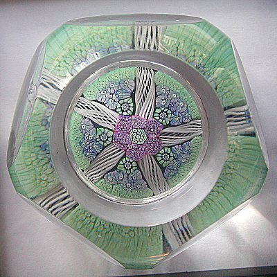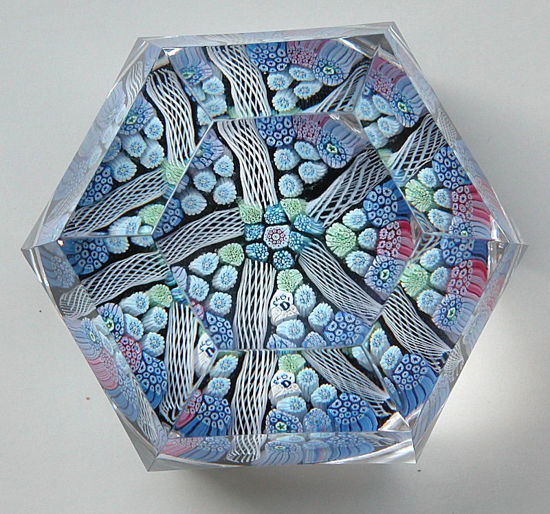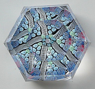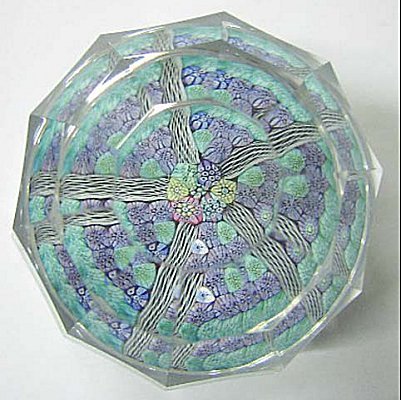Some of the most beautiful Whitefriars weights are those where complex millifiore canes are divided into panels with latticino canes. The are a potentially large numbers of variants and they don't seem to be that well documented with the exception of a few which are documented limited edition weights. 5 or 6 panelled weights are the commonest, but we also have a 3 panelled one in our collection. Do 4 panelled weights exist? We have never seen one in the flesh or illustrated. If any one has one we would be interested to hear of it as well as any with higher numbers of panels.