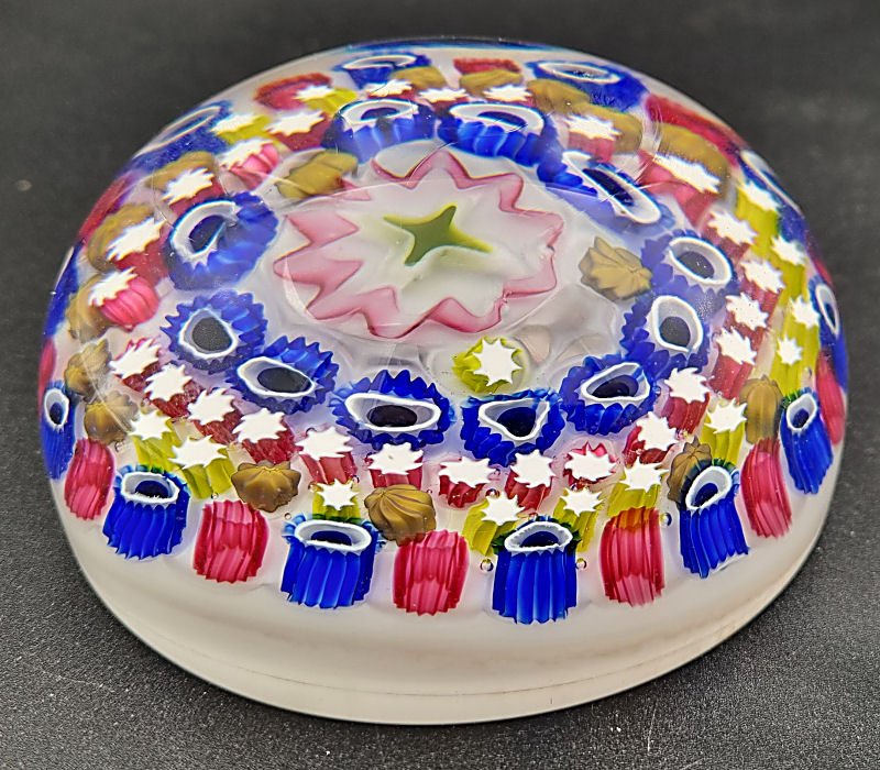A very large antique Val St Lambert paperweight. Roghly a concentric on an off-white base with no torsade and a very large central cane. Weight : 1,030g, 103mm diameter, 54mm high Val St Lambert Page 1Val St Lambert Page 2Val St Lambert Page 3Val St Lambert Page 4Val St Lambert Page 5Val St Lambert Page 6Val St Lambert Page 7Vsl Overlay Cut PaperweightsVal St Lambert from FarfallaVal St Lambert from Dr StammwitzVal St Lambert Page 2 from Dr StammwitzVal St Lambert Page 3 from Dr Stammwitz |