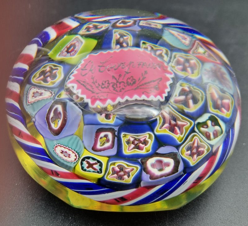Antique Val St Lambert paperweight. Yellow ground of Uranium glass, yrllow, red white an blue off center torsade, two rows of odd squarish canes, Center is a pnk hexagonal plaque with a difficult to read inscription. I might ead A Loerman. The base has eight unusual cut facets possibly added later to cover damage. Weight: 935g Width: 9.3cm Height: 5.3cm Val St Lambert Page 1Val St Lambert Page 2Val St Lambert Page 3Val St Lambert Page 4Val St Lambert Page 5Val St Lambert Page 6Val St Lambert Page 7Vsl Overlay Cut PaperweightsVal St Lambert from FarfallaVal St Lambert from Dr StammwitzVal St Lambert Page 2 from Dr StammwitzVal St Lambert Page 3 from Dr Stammwitz![]() |