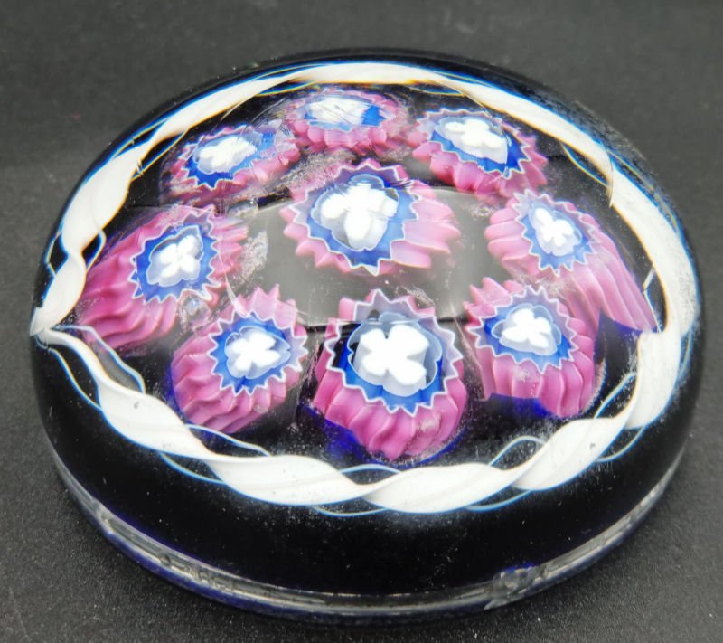 Antique Val St Lambert Paperweight. Classic form with grooved base. Solid black background with pure white torsade and a circ;e of 8 and one centrsl millifiore canes.
