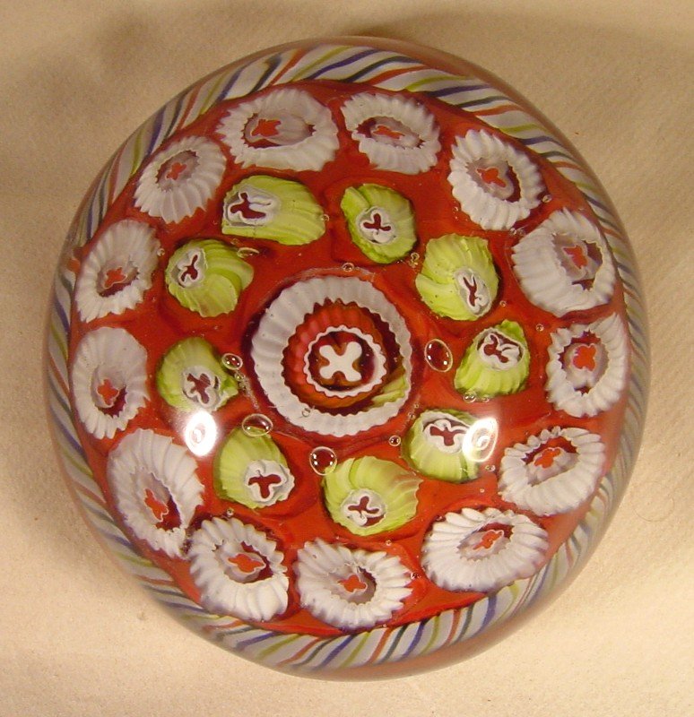 cog-canes with a cross centre and an outer row of white cog-canes also with a cross centre on an orange-red ground. A four colours and white torsade surround the millefiori. Hollow polished pontil and typical base groove. Size : 98mm Diameter, 66mm High, Weight : 1130 grams. Collection and Photograph: Eddy Schoofs, Belgium