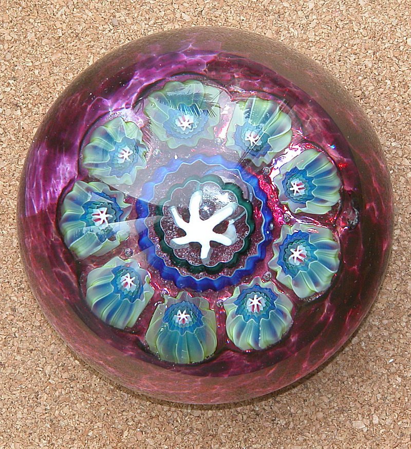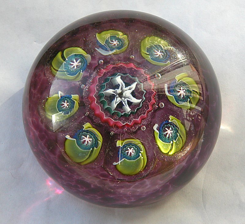 We recently added a second nice millefiore Val St Lambert paperweight to our collection. This one is smaller at 3.1 inches in diameter and lacks a torsade but has all the other features including layered pastry-cane millefiori and injected bubbles. Weight 618g. It is probably from a similar period and is in excellent condition. A few named Val St Lambert paperweights on eBay recently have made excellent prices. We recently purchased an almost identical VSL paperweight to this early acquisition. It differs only in that the canes are diffrent colours. It is very rae to find similar VSL paperweights. |