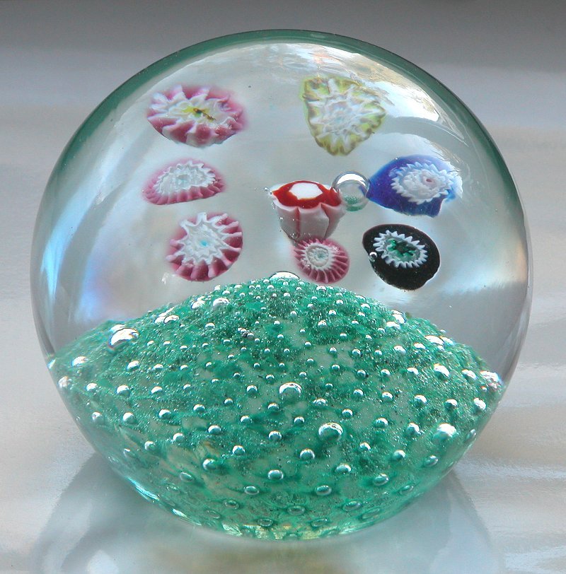 Large Val Saint Lambert paperweight with green ground with included bubbles and eight floating millefiore canes. 95mm wide, 90mm high. Weight 1316g. Base ground flat and scratch inscribed Val st Lambert 54 (?1954) Collection and Photograph: Suzanne & Tony Mace, UK