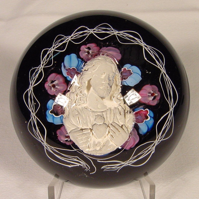 Antique magnum Val Saint Lambert paperweight with a central sulphide of Christ and a ring of blue and pink millefiori surrounded by a double twisted white spiral on a black ground. Flat polished base and base groove. Size: 101mm diameter, 51mm High, Weight: 980 Collection and Photograph: Eddy Schoofs, Belgium