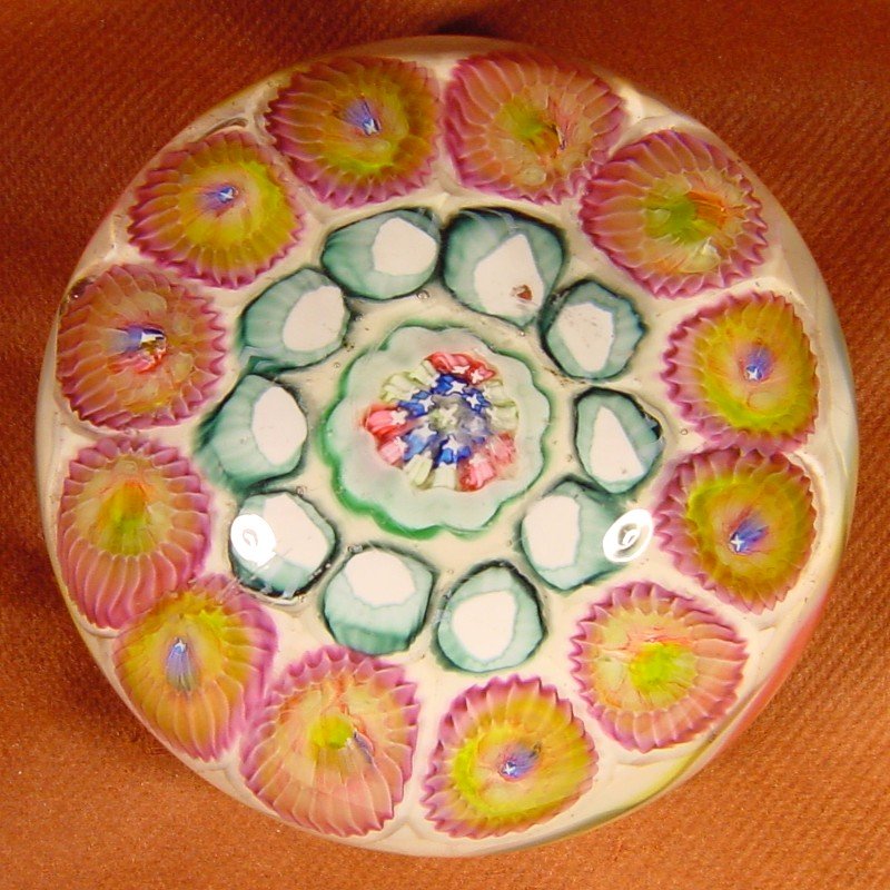Antique magnum Val Saint Lambert millefiori paperweight. Setup with a large central complex millefiori, one row of green-white millefiori and an outer row of super large cog-canes on a "sodden snow" ground. A three color and white torsade surrounds the white ground. Hollow polished pontil and typical base groove. Size : 98mm Diameter, 66mm High, Weight : 1130 grams. Collection and Photograph : Eddy Schoofs, Belgium